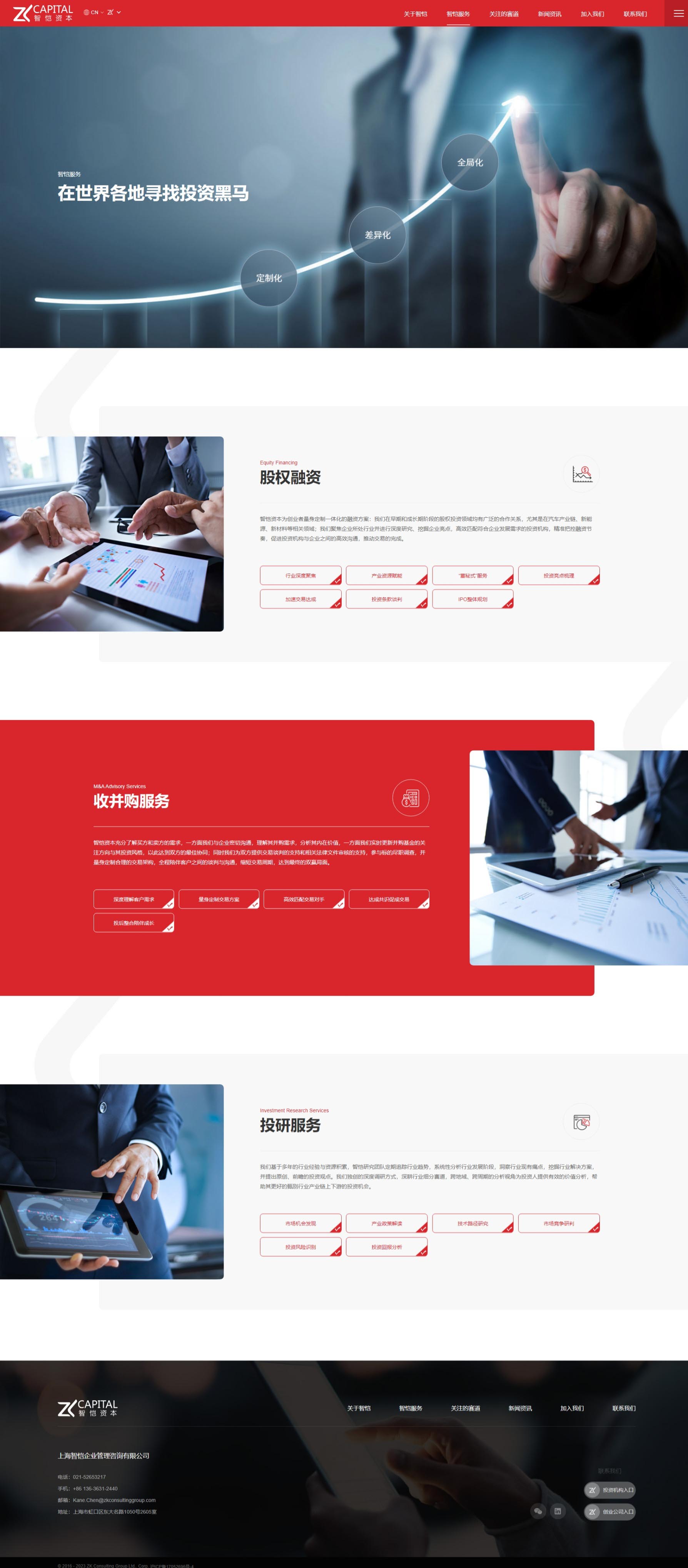 智恺资本网站风格定位精准,融合专业与活力,展现现代感与细节关怀。以红色为主调,彰显企业热情与进取,辅以灰白黑,营造稳重氛围。布局清晰,导航便捷,信息架构合理,确保用户高效浏览。多媒体内容丰富,展示企业专业实力与创新成果。同时,注重细节处理,如优化加载速度、减少干扰元素,提升用户体验。