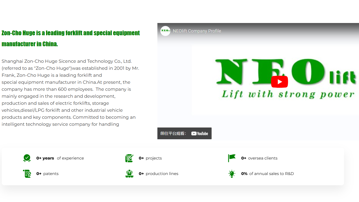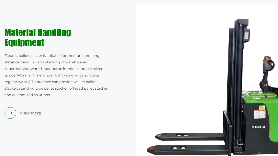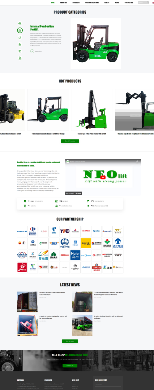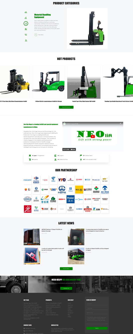 Neoforklift网站的色彩搭配以绿色和白色为主,辅以灰色和黑色,营造出一种专业、稳重而又不失现代感的视觉效果。绿色代表科技、专业与信任,白色则象征着简洁、纯净与高效,这样的色彩组合能够很好地传达出公司的品牌形象和产品特性。