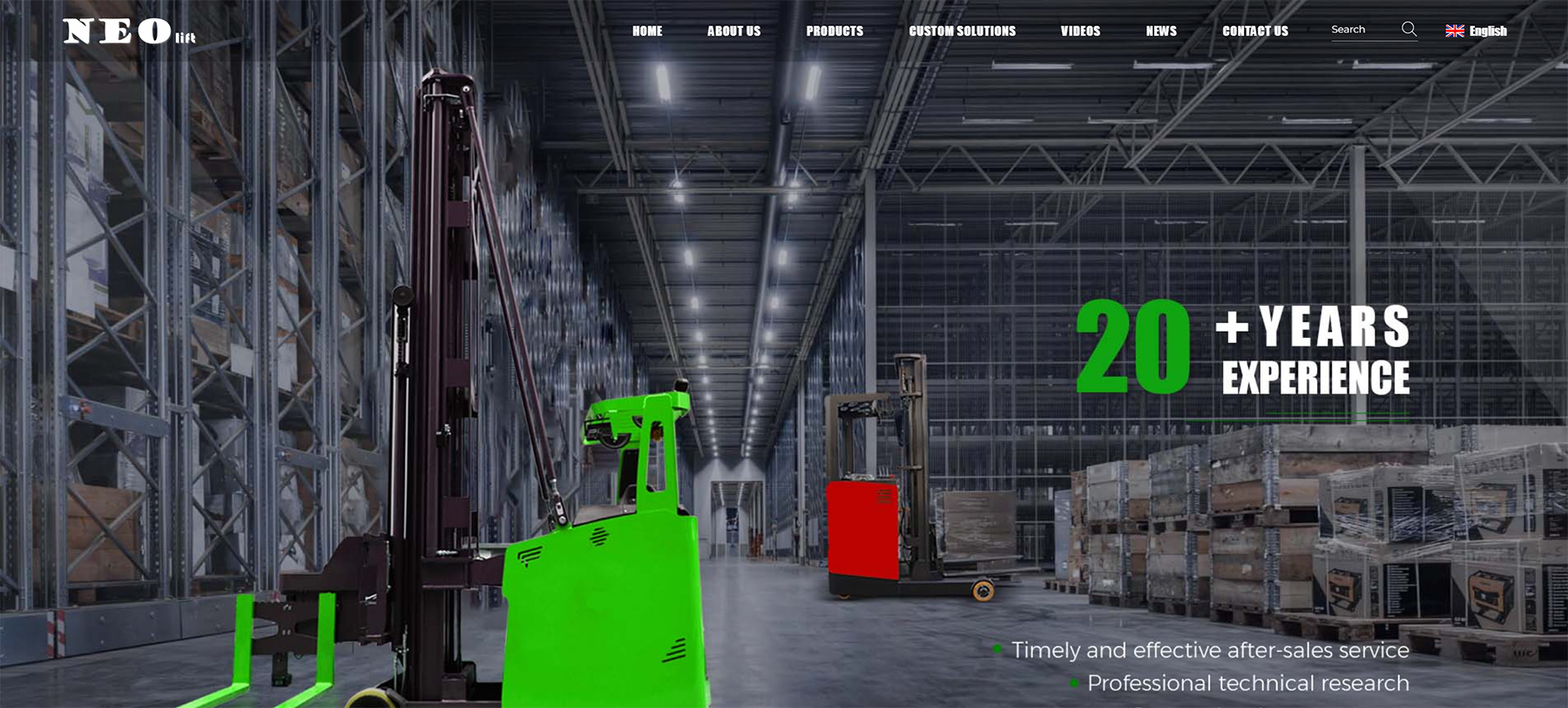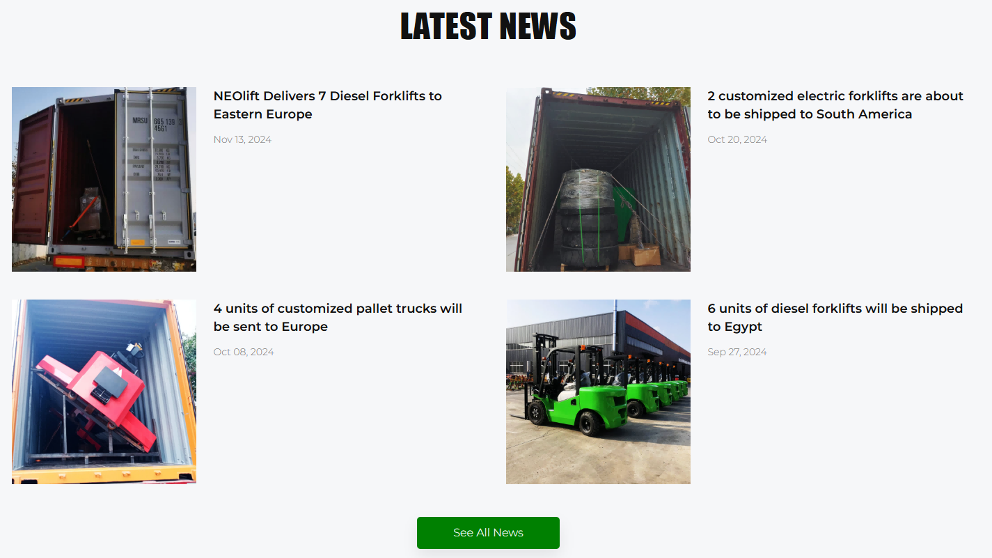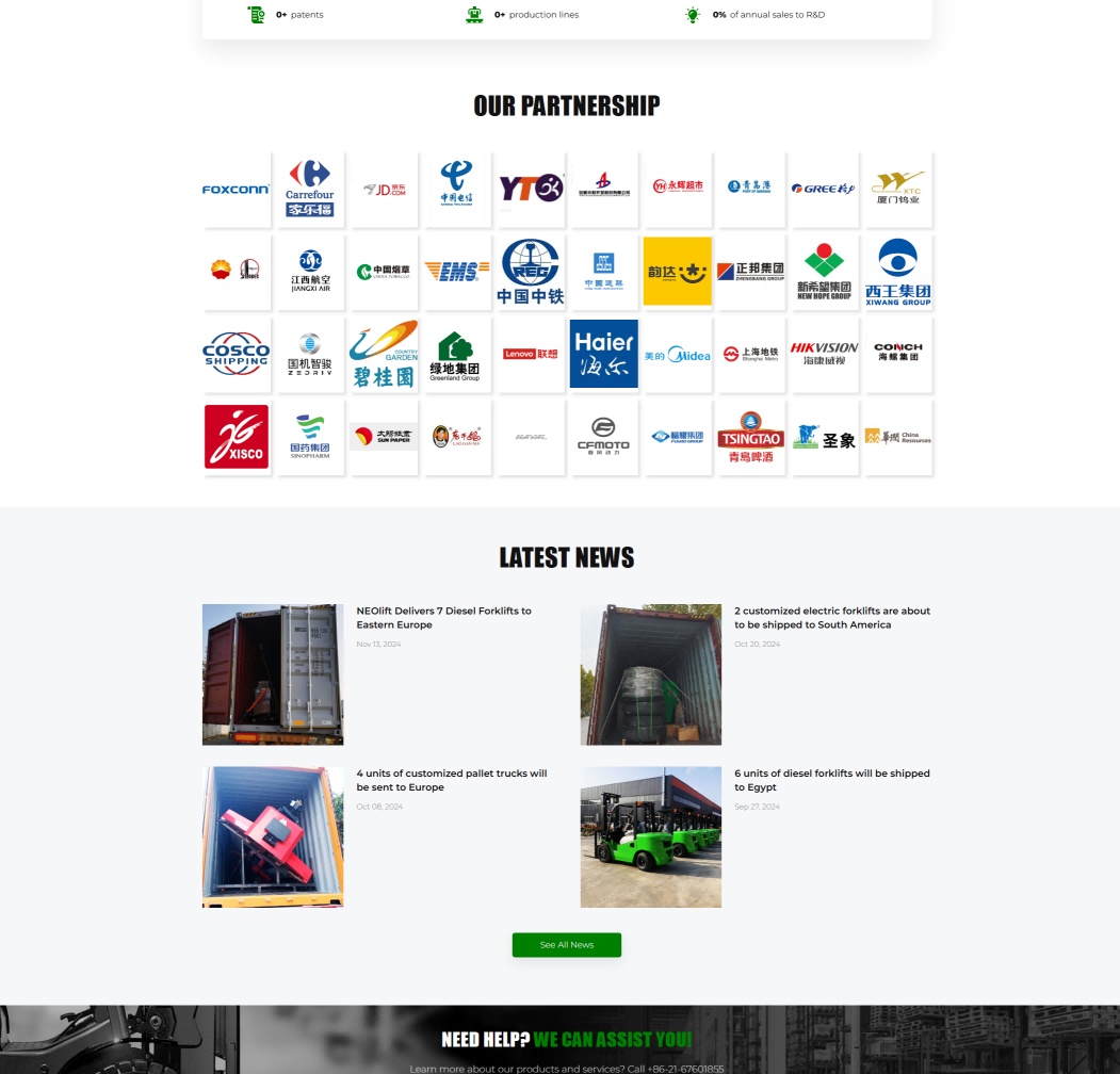 Neoforklift网站的色彩搭配以绿色和白色为主,辅以灰色和黑色,营造出一种专业、稳重而又不失现代感的视觉效果。绿色代表科技、专业与信任,白色则象征着简洁、纯净与高效,这样的色彩组合能够很好地传达出公司的品牌形象和产品特性。