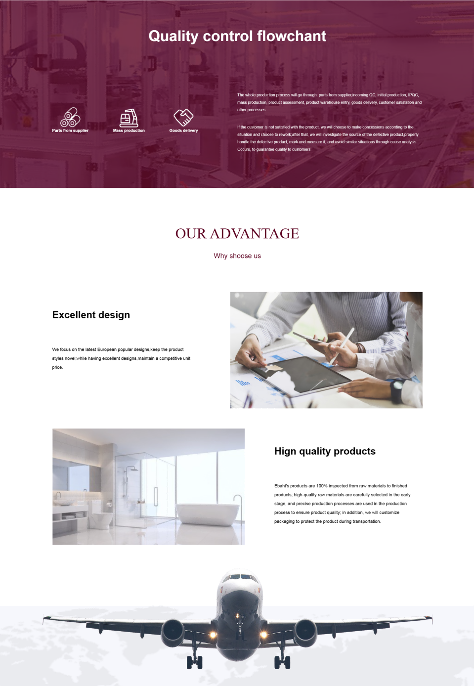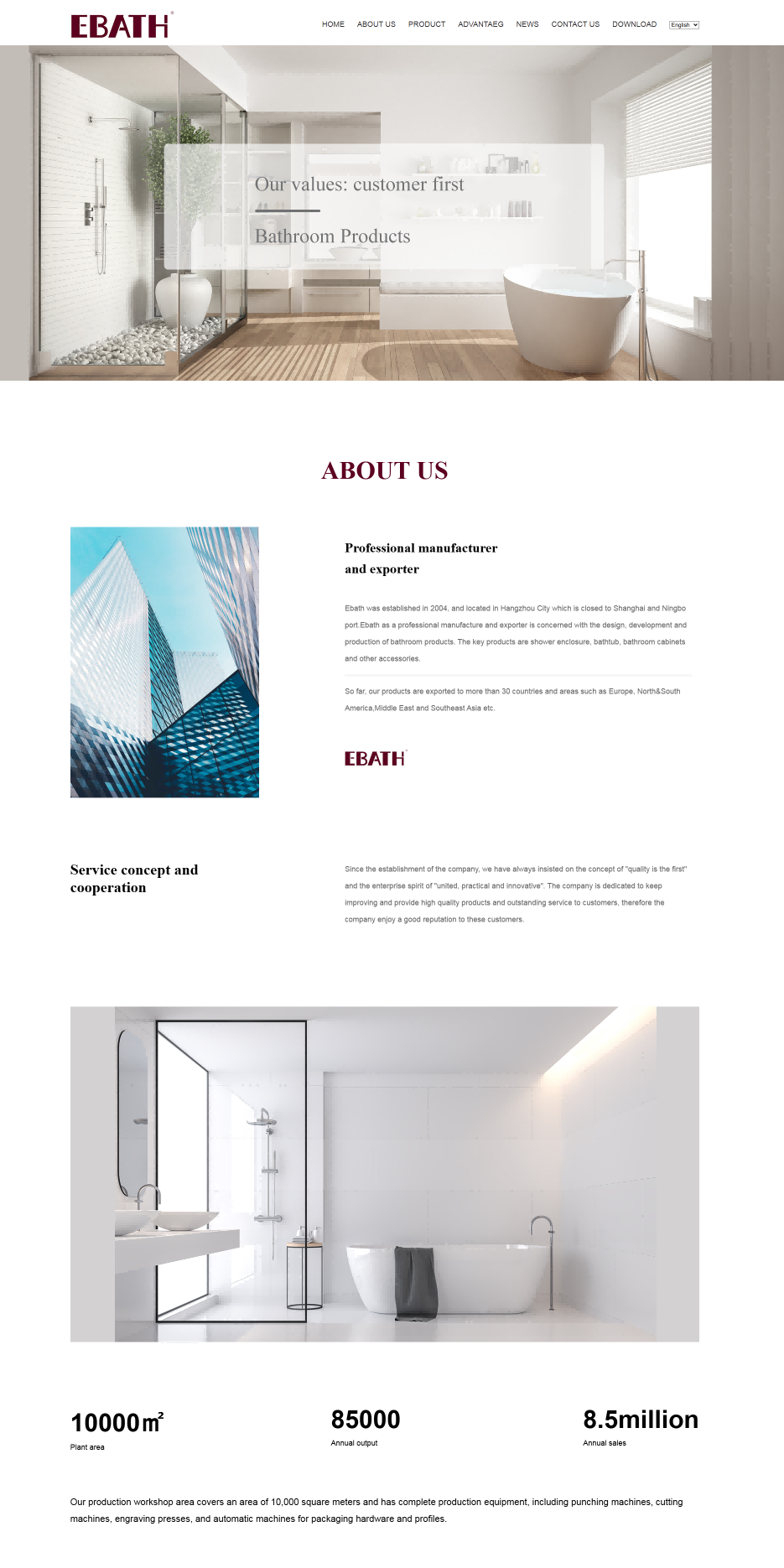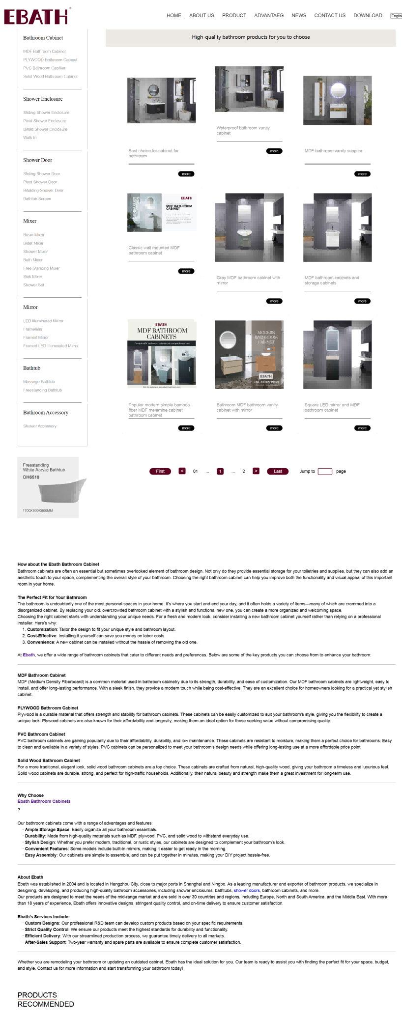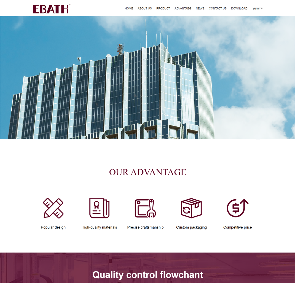 Ebath 的网站旨在展示丰富多样的卫浴产品线,包括淋浴间、浴缸、浴室柜等各类产品及配件,吸引全球客户关注。通过详细的产品介绍、图片展示和技术参数说明,为客户提供全面的采购信息。同时,突出自身的专业制造能力、优质服务和工厂批发优势,促进产品销售,提升品牌在国际卫浴市场的知名度与影响力。