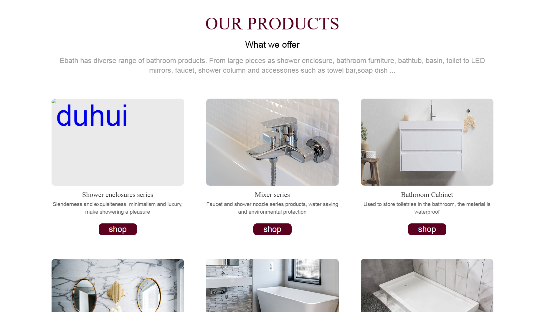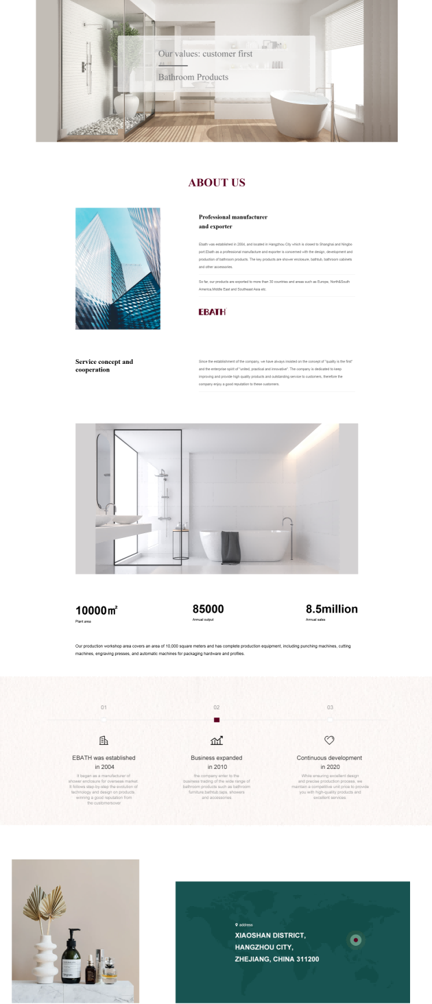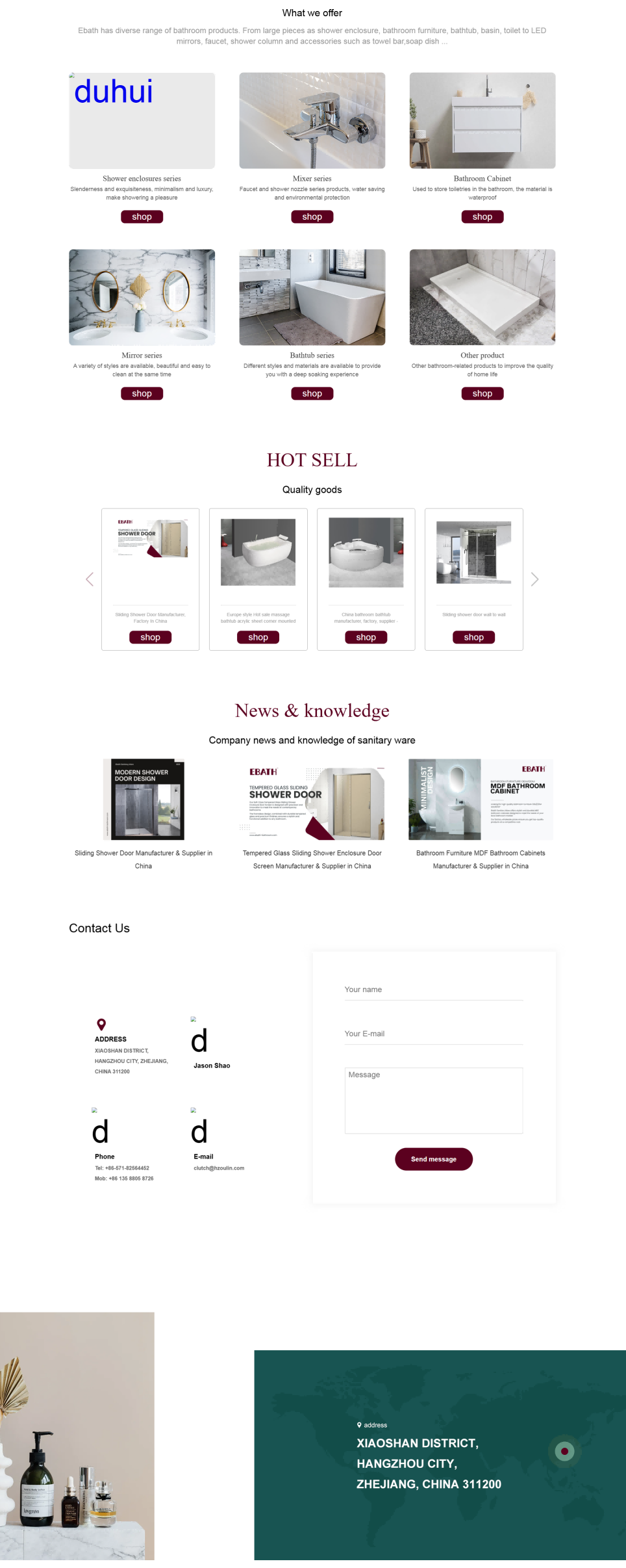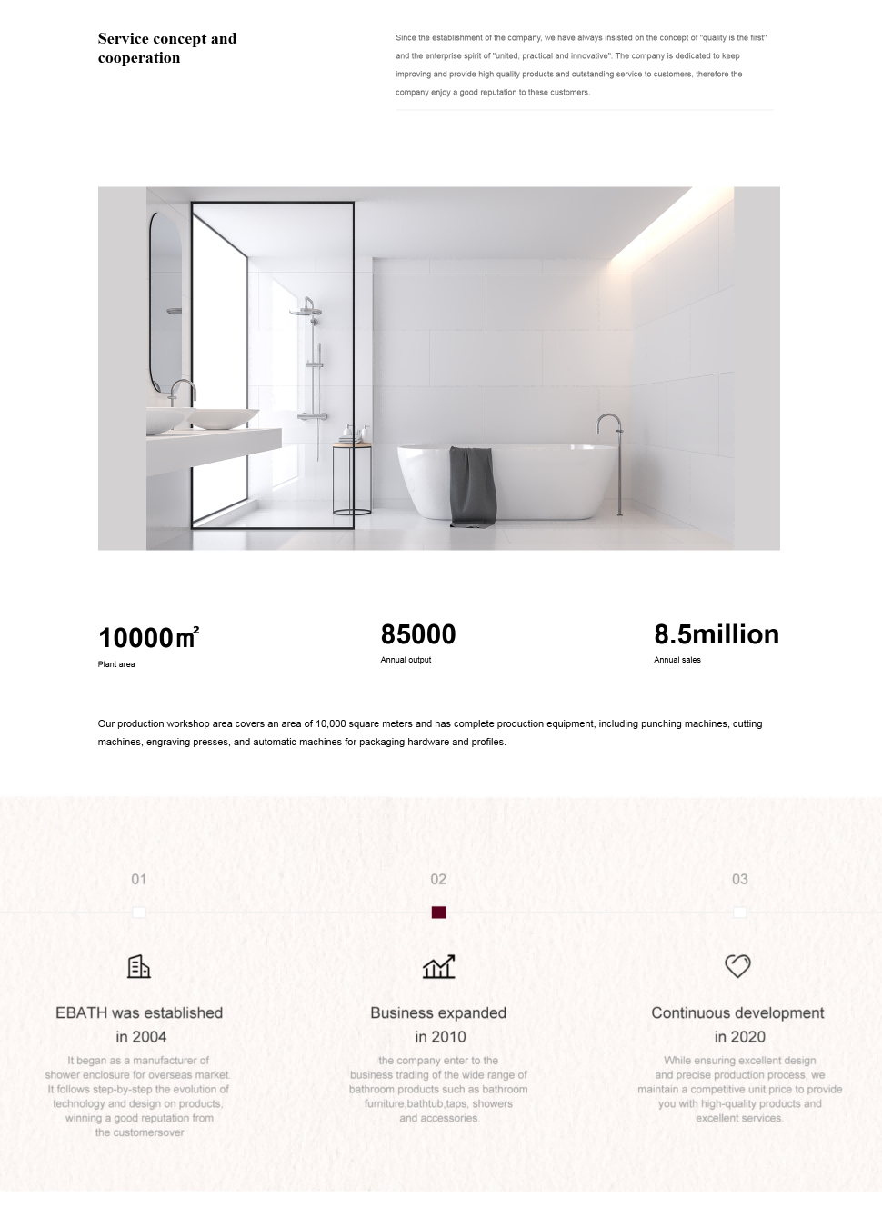 Ebath 的网站旨在展示丰富多样的卫浴产品线,包括淋浴间、浴缸、浴室柜等各类产品及配件,吸引全球客户关注。通过详细的产品介绍、图片展示和技术参数说明,为客户提供全面的采购信息。同时,突出自身的专业制造能力、优质服务和工厂批发优势,促进产品销售,提升品牌在国际卫浴市场的知名度与影响力。