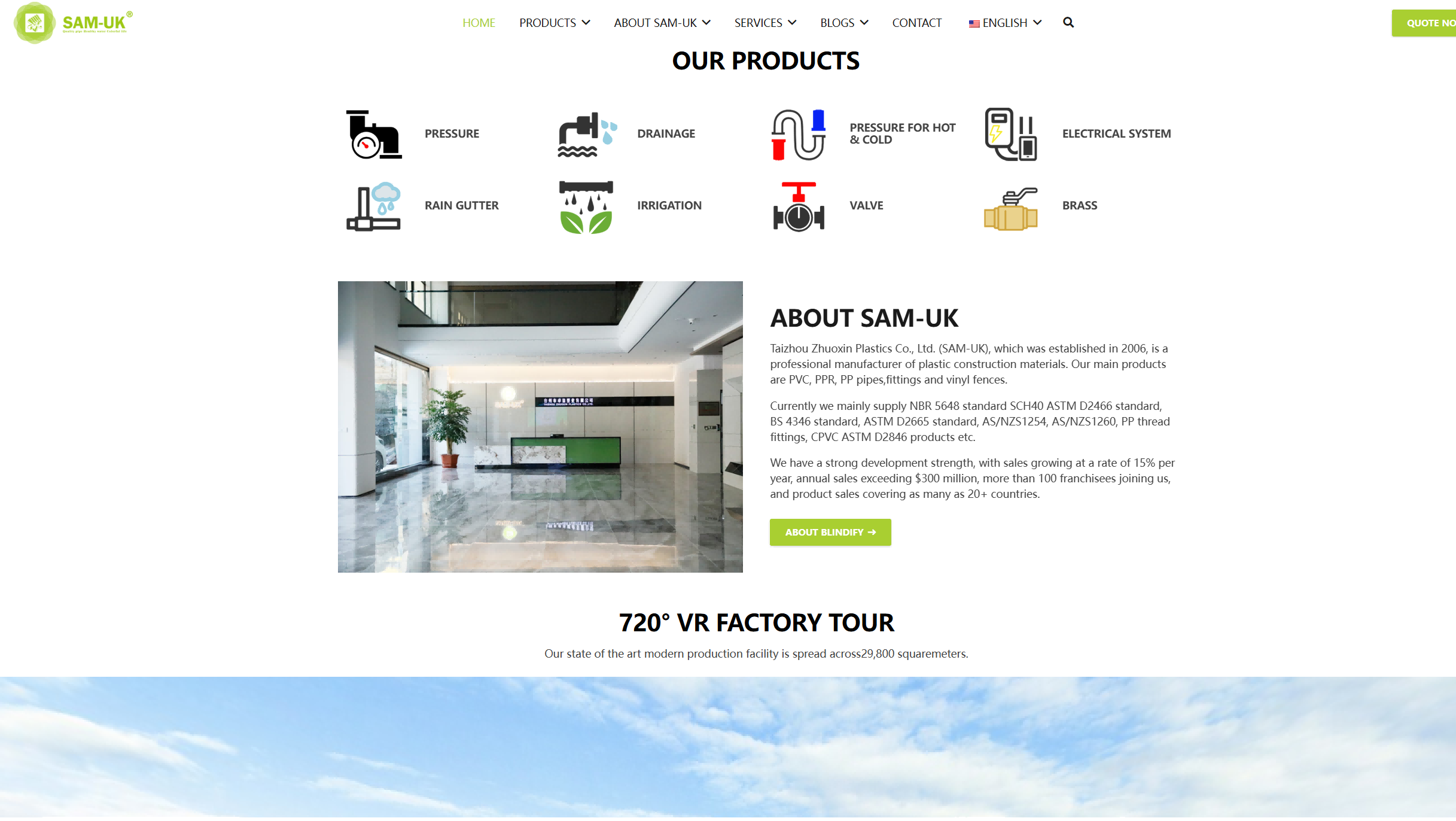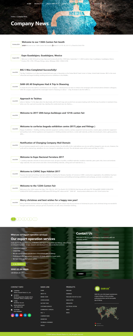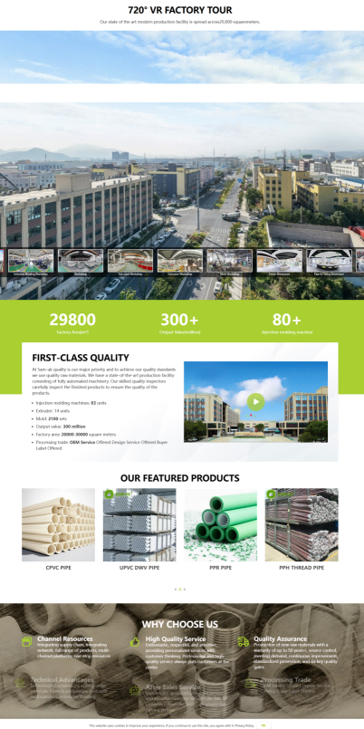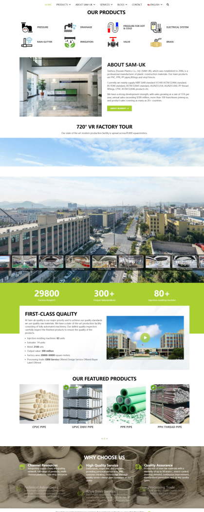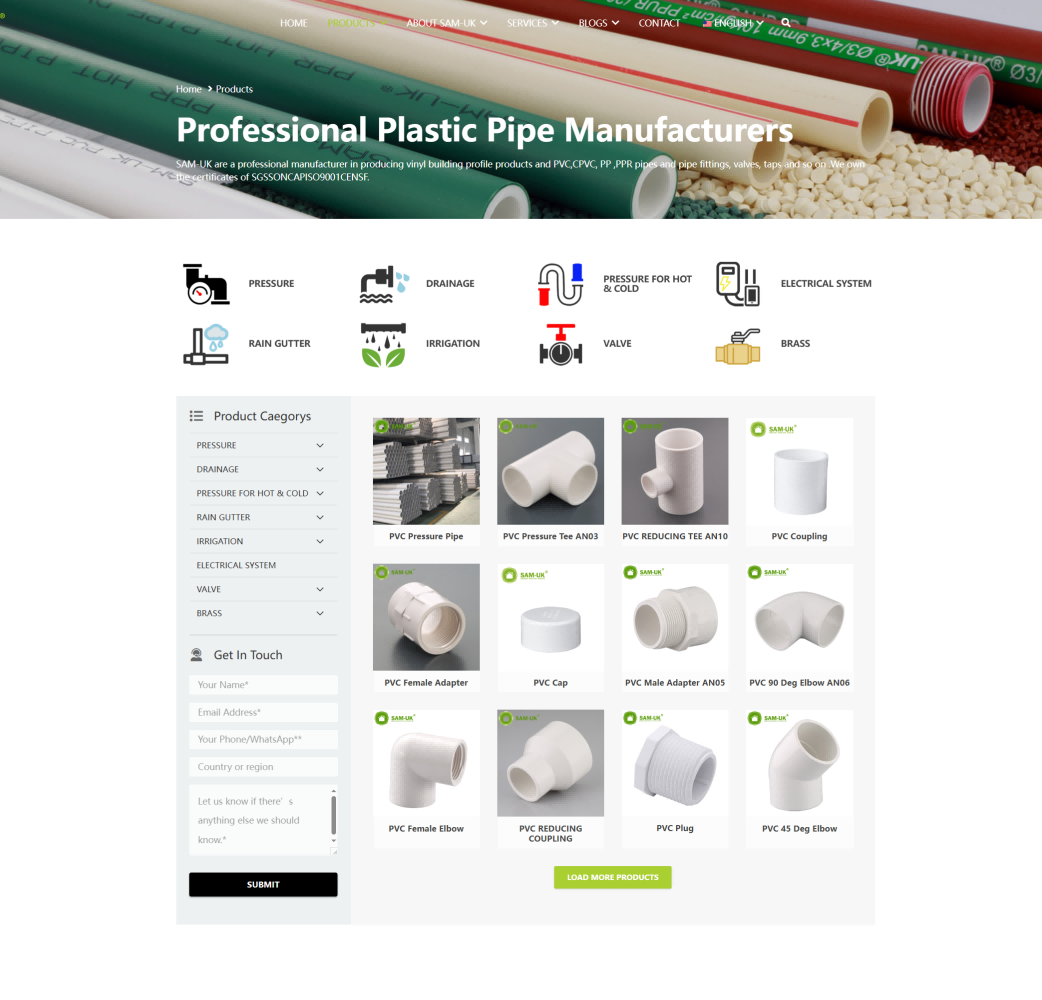 网站旨在全面展示 SAM - UK 的塑料管材管件产品系列、强大的生产实力与优质的服务优势。通过详细的产品分类介绍、企业规模与认证展示、技术和售后等服务说明,向全球客户传递专业可靠的品牌形象,吸引潜在客户合作,为其提供管道系统解决方案,从而提升品牌在塑料建材行业的知名度与影响力,促进产品销售与市场拓展。
