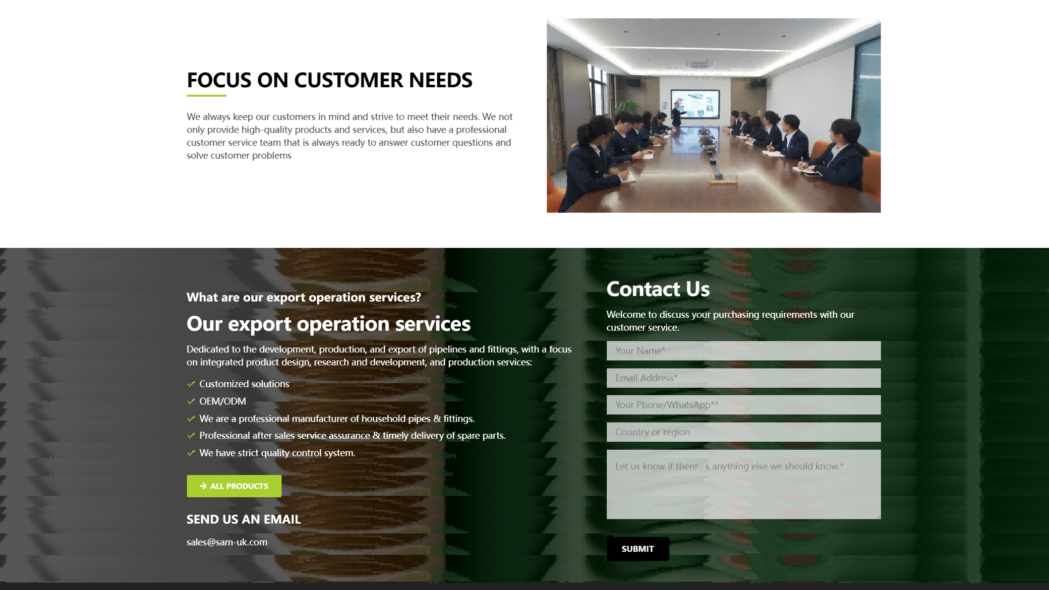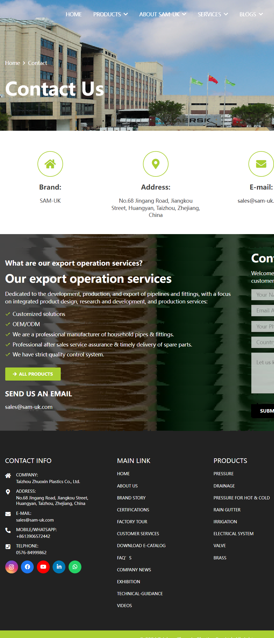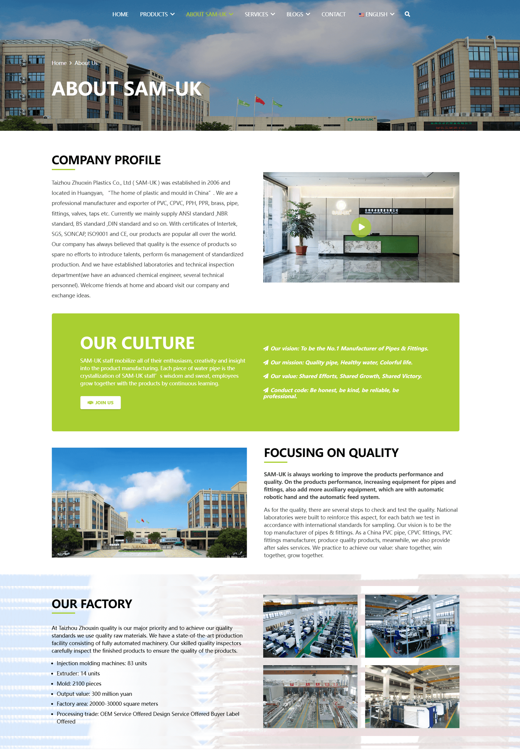 网站旨在全面展示 SAM - UK 的塑料管材管件产品系列、强大的生产实力与优质的服务优势。通过详细的产品分类介绍、企业规模与认证展示、技术和售后等服务说明,向全球客户传递专业可靠的品牌形象,吸引潜在客户合作,为其提供管道系统解决方案,从而提升品牌在塑料建材行业的知名度与影响力,促进产品销售与市场拓展。