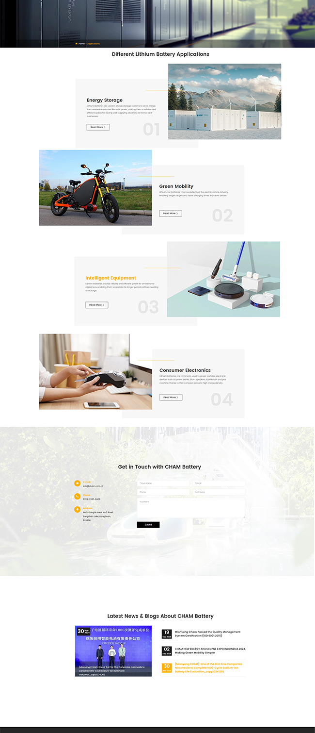 网站采用简洁大气的设计风格,以科技蓝为主色调,传达出专业、创新和环保的理念。网站整体色调和谐统一,蓝色与白色的搭配营造出科技感和现代感,同时辅以绿色元素,象征着新能源和环保,符合公司作为锂电池制造商的定位。